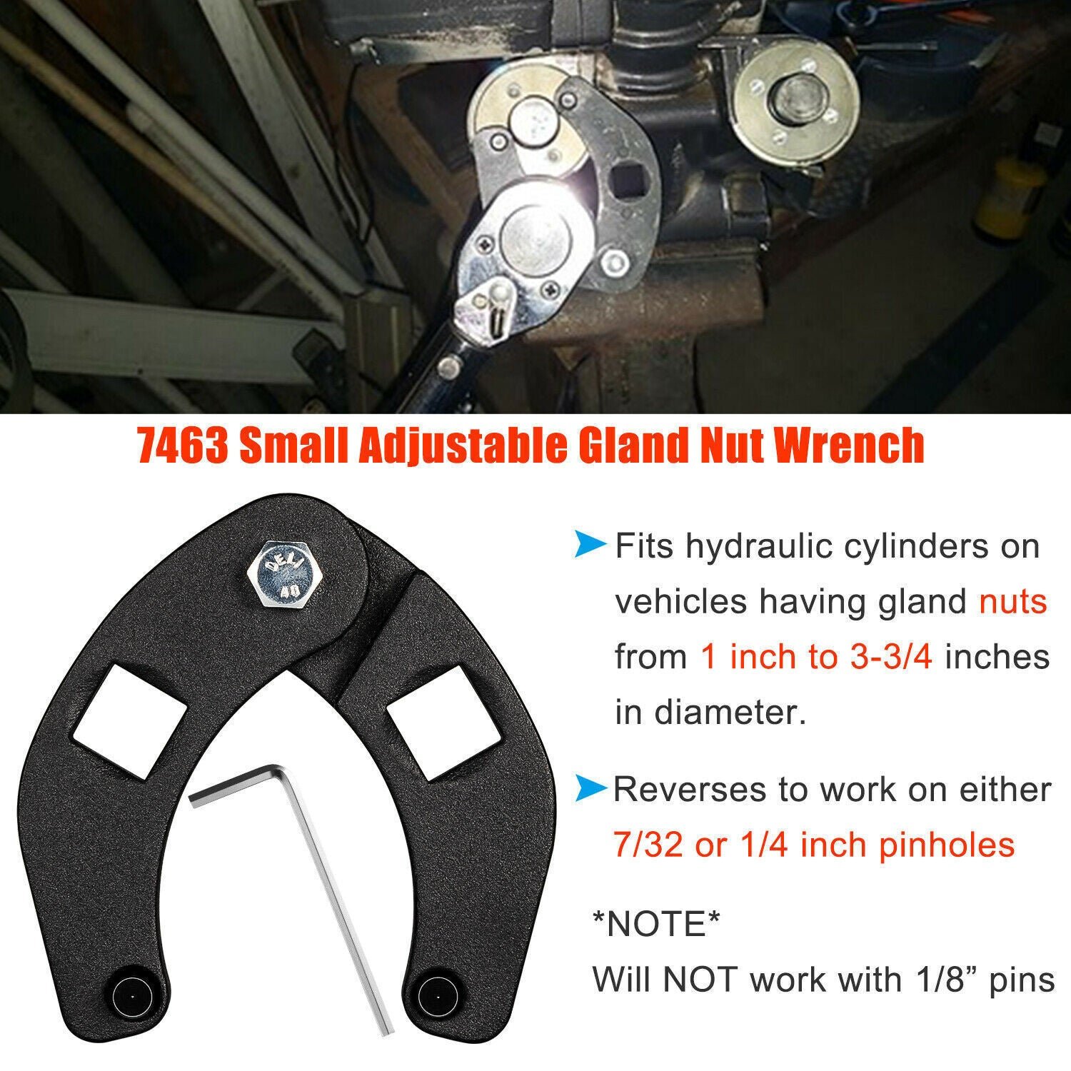 【7463 Small Universal Gland Wrench】Fit to the gland nuts from 1” to 3-3/4” diameter; Reversible to fit 1/4 inch and 7/32 inch diameter pinholes(Similar to OTC 7463).