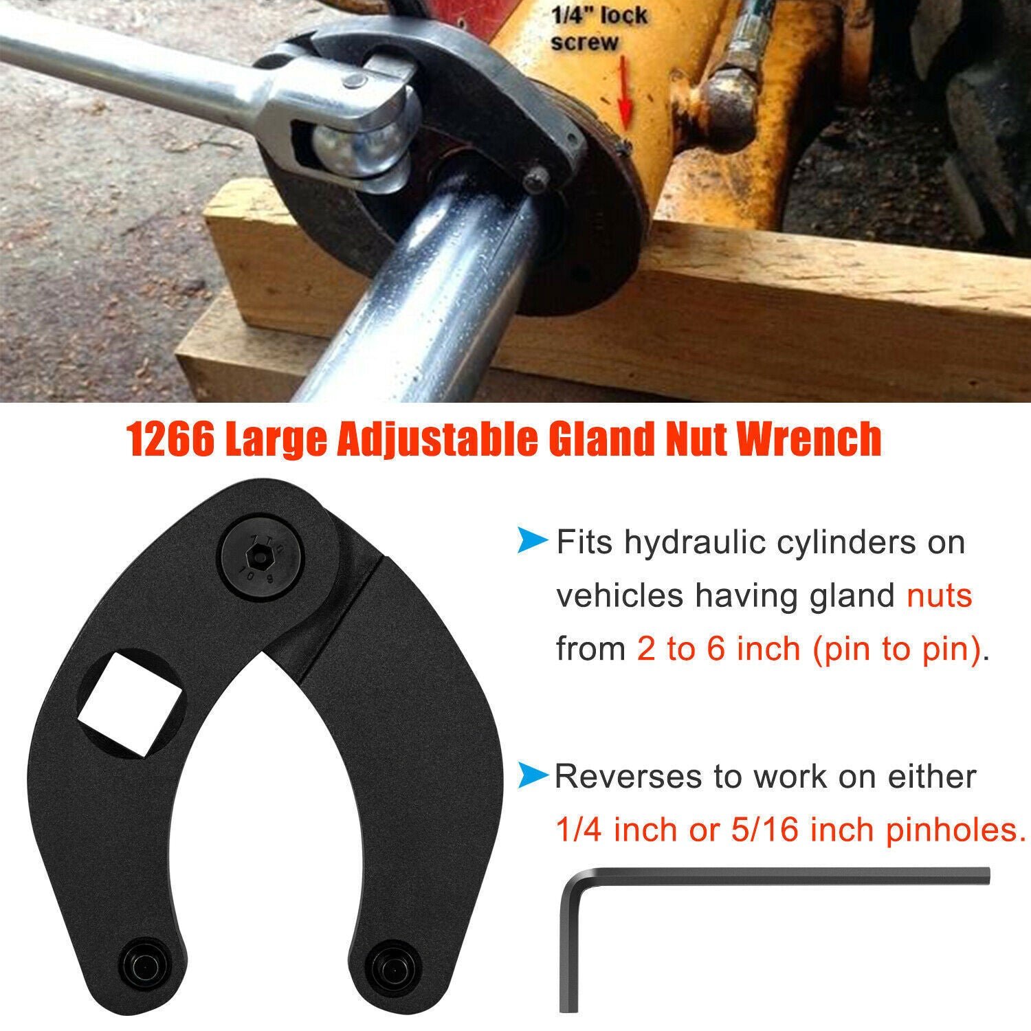 【1266 Adjustable Gland Nut Wrench】Offers customized fit to the gland nuts from 2 inches to 6 inches diameter; Reversible to fit 1/4 inch and 5/16 inch diameter pinholes (Similar to OTC 1266).