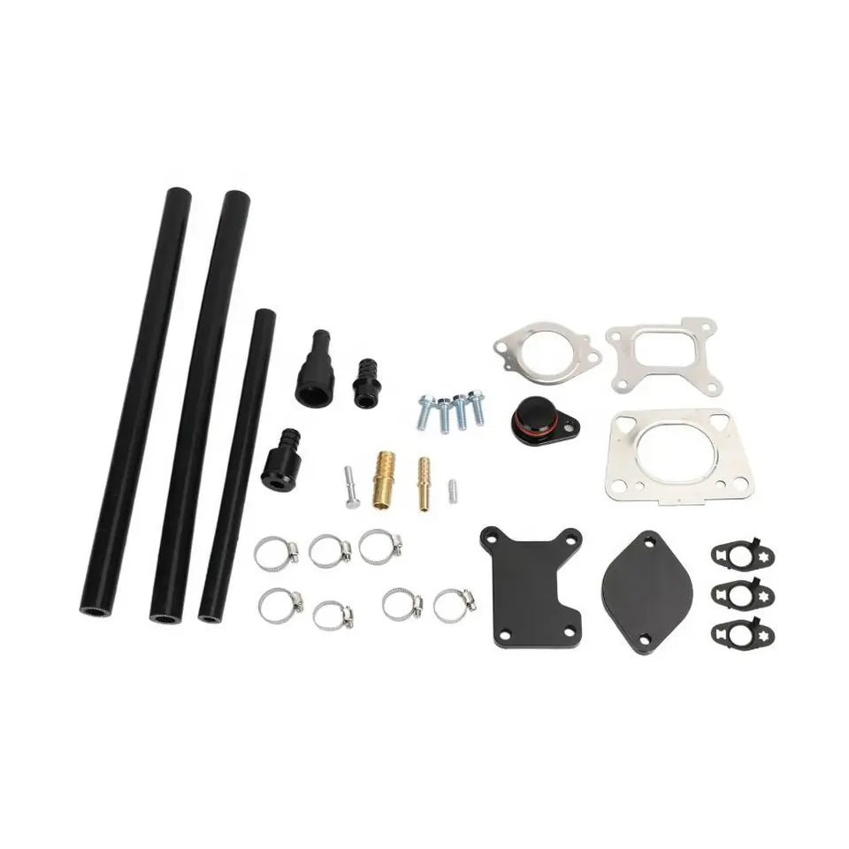 This EGR delete is engineered and designed to recirculate engine coolant faster and more efficiently than the stock EGR system. High quality components consist of billet aluminum construction. nickel plated steel flanges. stainless steel dipstick tube brackets. high temp silicone hoses. zinc coated hardware & precision fit o-rings.